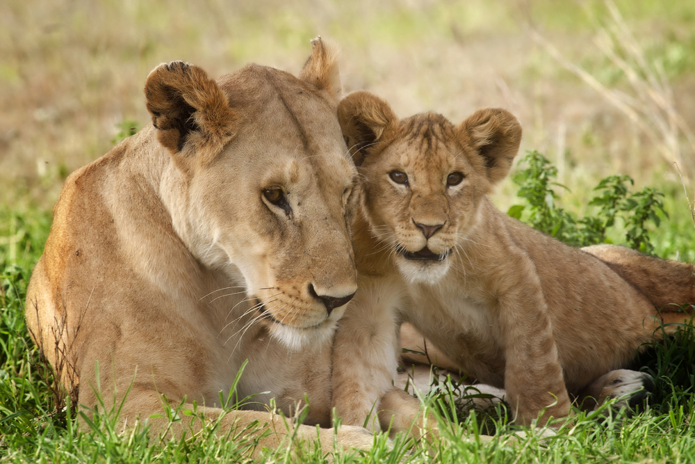 A lioness affectionately rubs cheeks with her cub
