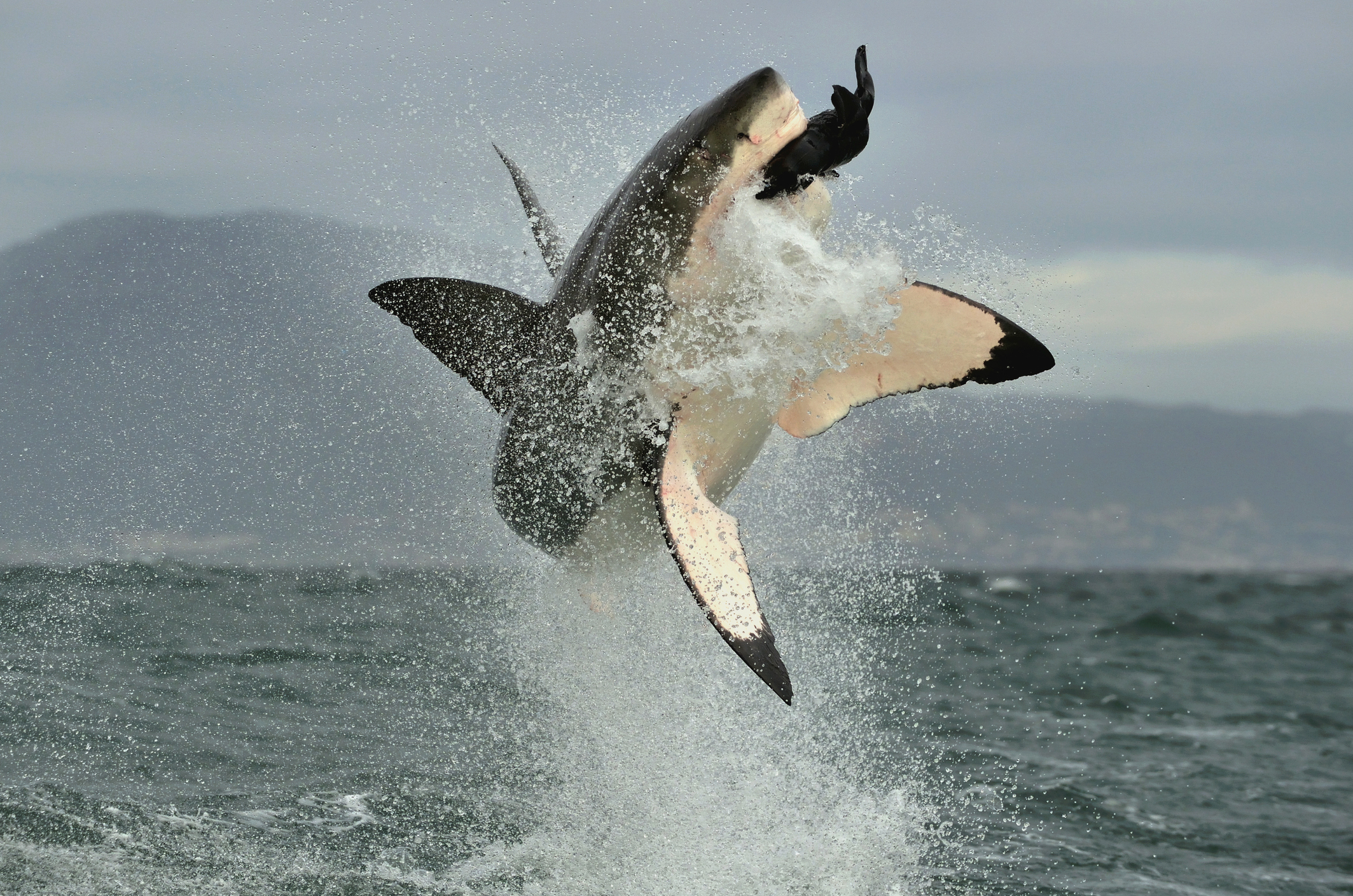 Great White Shark (Carcharodon carcharias) breaching in an attack.