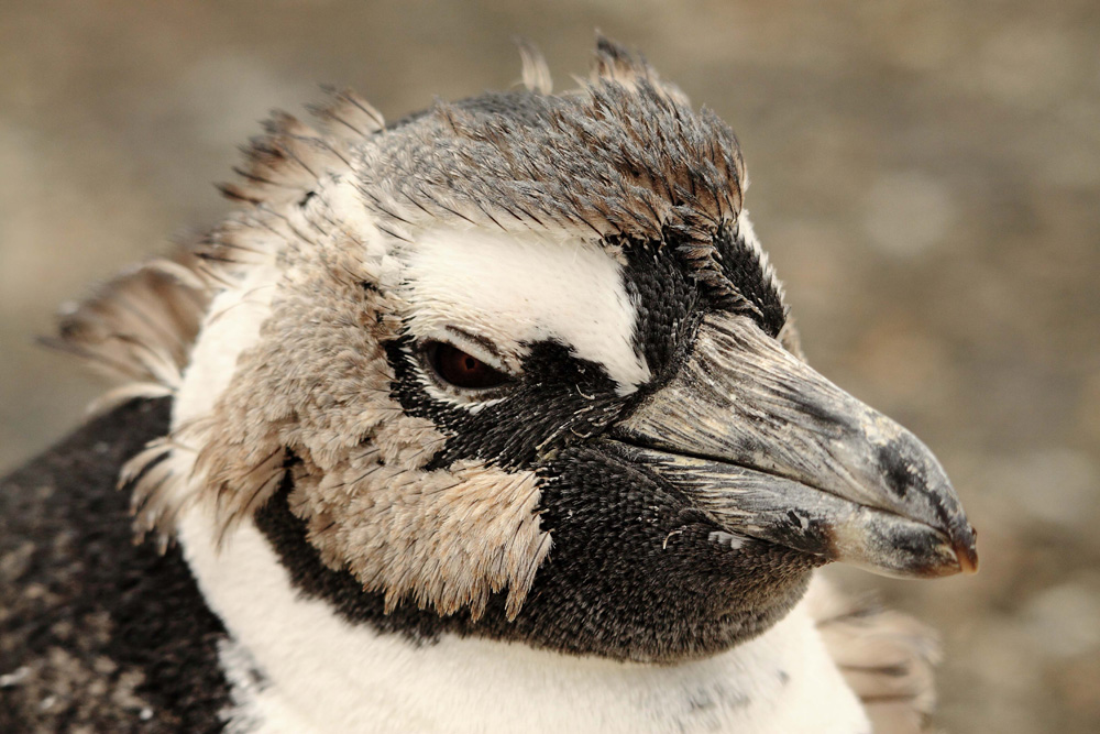 A juvenile African penguin moulting her first feathers
